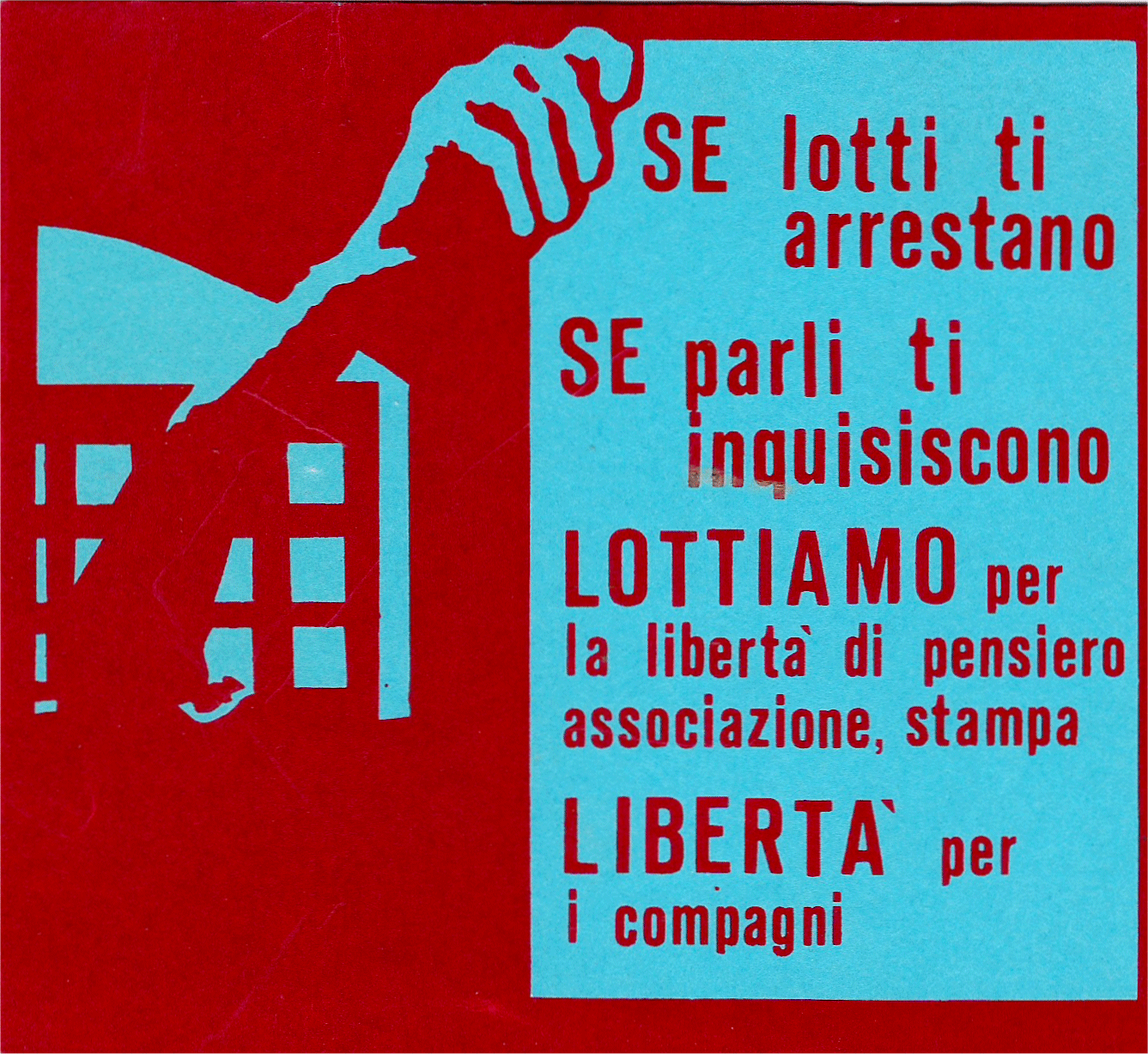 1977-1978 anche in questo periodo detti il mio contributo ma più episodicamente alla produzione grafica di manifesti. La serigrafia è un’arte riproduttiva molto buona nel rapporto prestazioni/resa del lavoro, e non necessitano grandi fondi, se ci si limita alla produzione manuale, per lavorarci. Serve uno spazio dove asciugare i manifesti, qualche telaio, un impressionatore per lastre, che viene usato per la seta che servirà alla stampa, un armadio di vernici, un lavandino, e un tavolo per tirare i fogli a stampa.